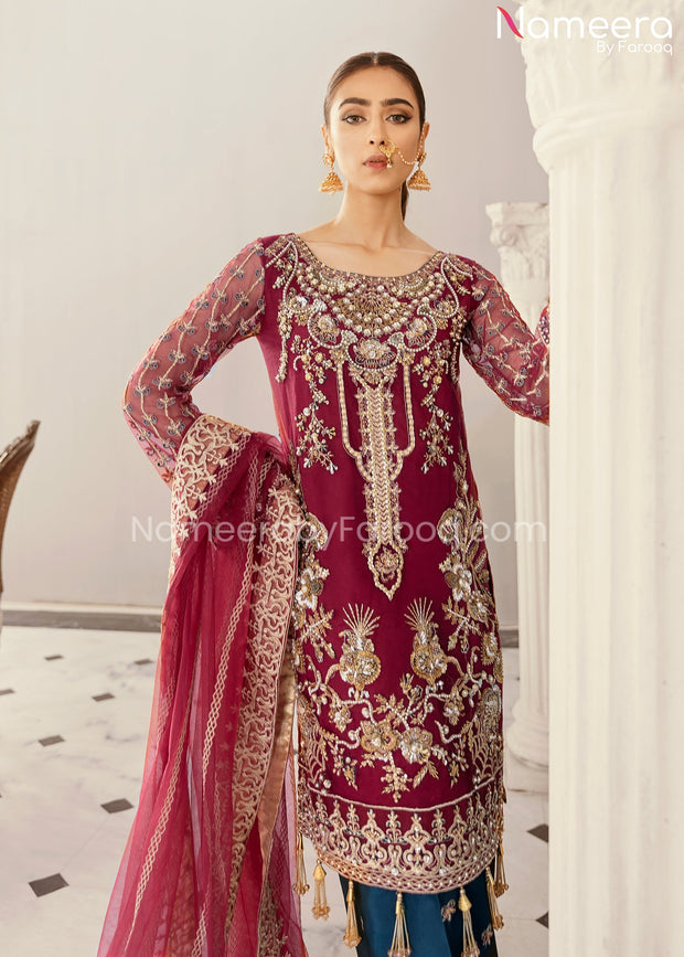 Kameez: Beautiful Kameez in Maroon color is gracefully embroidered and embellished with silver work, beads, dabka, stones and intricate thread work. This gorgeous Embroidered Kameez is a perfect choice to pair with trouser.